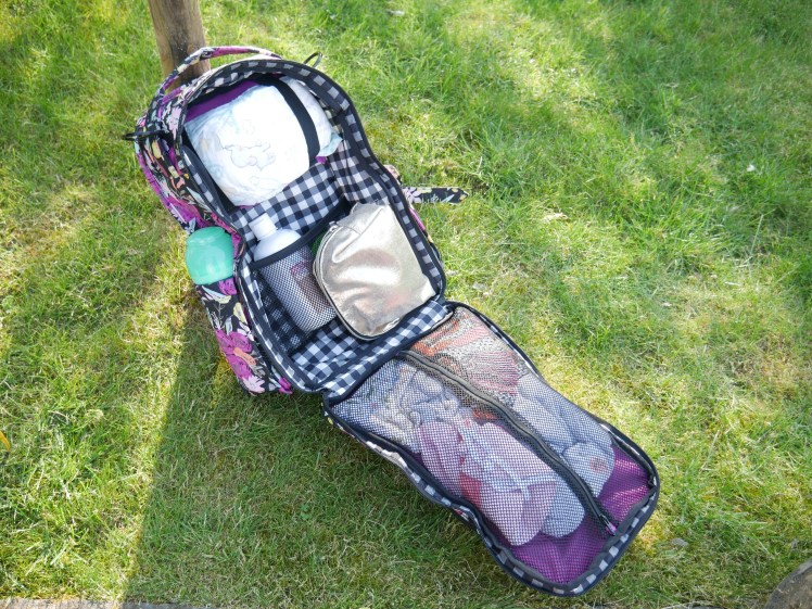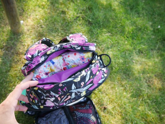 Dans la poche principale et notamment dans le filet respirant je range une tenue de rechange, un bavoir, le béguin. On trouve également sa pochette à cotons, le liniment, les couches « fixées » grâce à deux élastiques. J’avais également emporté le repas du midi ainsi que le goûter de Mila-Rose.