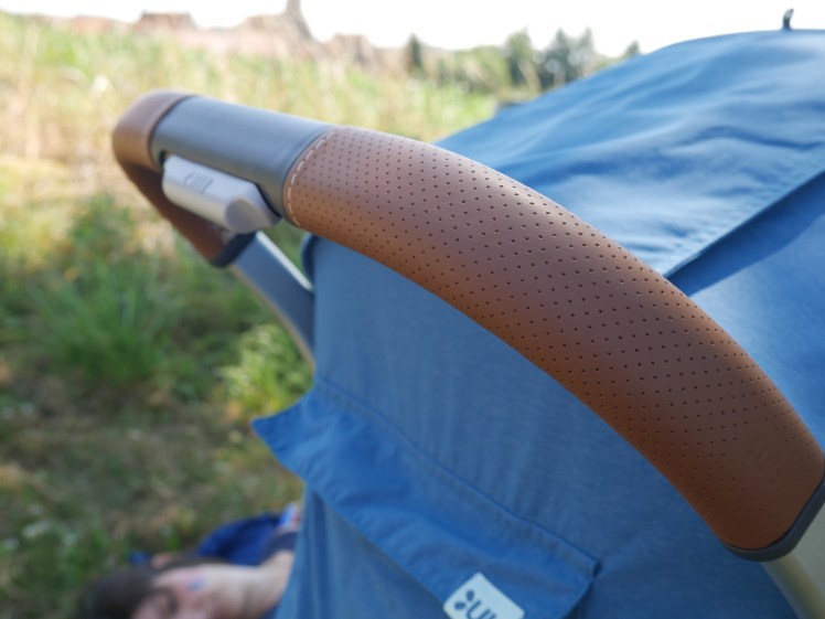 Pour commencer, parlons du design et du look de la poussette. Je vais le dire: j’adooooore! Je trouve cette poussette vraiment canon pour deux raisons: la couleur (que j’ai choisi) et les différentes matières présentes. Je suis totalement fan de ce tissu bleu canard qui s’associe très bien au cuir et à l’alu présents. C’est moderne, pep’s et coloré!