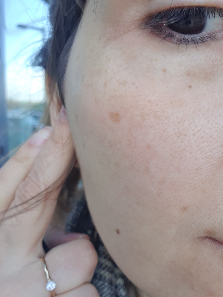 Lors de ma première grossesse, malgré une protection solaire, j’ai attrapé quelques micro-tâches autour des yeux et sur mes joues… . Rien de très visible jusqu’à ma seconde grossesse où les hormones plus une non-vigilance de ma part ont accentuées ce problème de tâches. Entre nous je ne voyais plus que ça en me regardant dans le miroir… Pas bon signe ça! (Cf photo ci dessous)