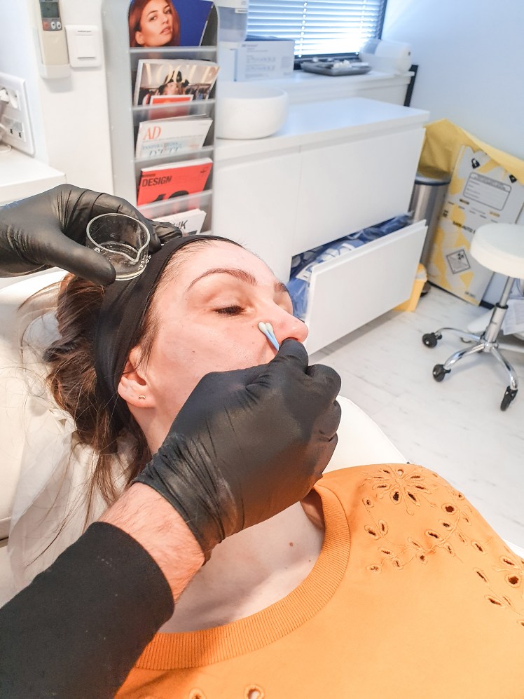 Je m’installe sur la chaise, le médecin fait quelques repérages avec un stylo sur mon visage puis il applique le produit à l’aide d’un coton tige. Il applique 3 couches (1 par une). Une 4ème couche est appliquée sur les taches les plus marquées. Le médecin masse ensuite l’ensemble de mon visage avec une crème. Et les sensations? Ça picote quelques instants au passage du coton tige puis ça se dissipe quelques secondes après. Forcément, ça picote davantage à la 3ème couche mais rien d’insurmontable car c’est rapide et sur une échelle de 0 à 10 je dirais… 3. Attention, chacun à un seuil de tolérance différent.