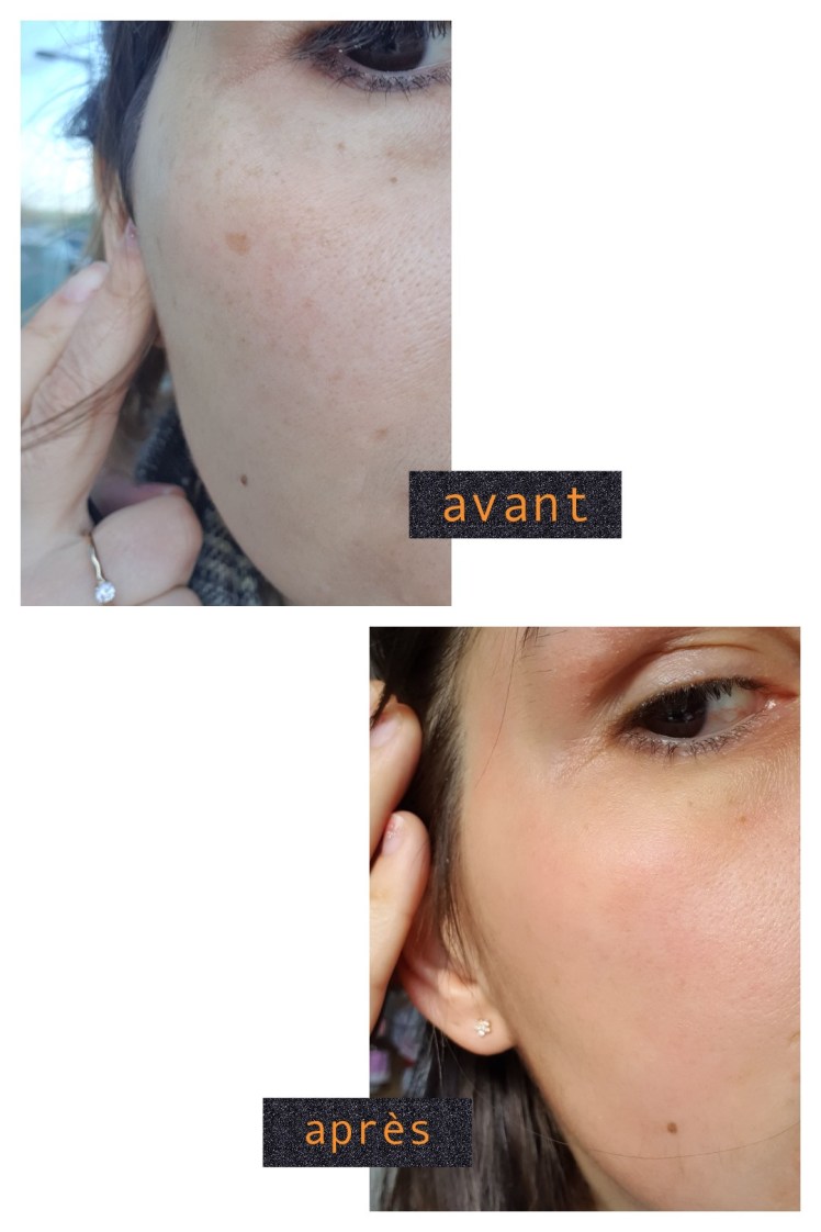 MAIS SURPRISE! TOUTES MES TACHES SONT PARTIES! Je pensais qu’il faudrait passer par le laser notamment pour la plus grosse (et donc la plus profonde) mais non! C’est vraiment une bonne surprise car même le médecin n’était pas certain que le produit agisse dessus! Je vois tout de suite que mon teint est bien meilleur, que ma peau est lisse, sans défaut et les pores sont atténués +++! J’ai enfin une belle peau comme peut-être je n’ai jamais eu!